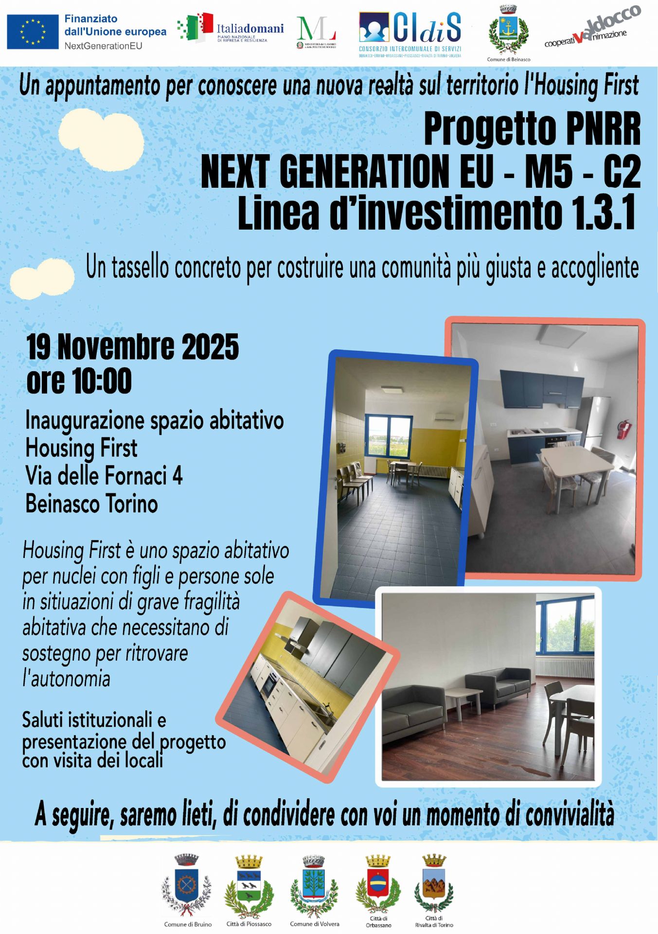 Un appuntamento per conoscere una nuova realtà sul territorio l'Housing First.📅 19 Novembre 2025 ore 10:00 📍👉 Via Delle Fornaci n 4 - Beinasco TorinoHousing First è uno spazio abitativo per nuclei con figli e persone sole.